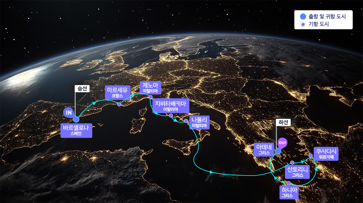 [도시 안내] ▶ 스페인 최대의 산업과 문회의 도시로 가우디의 예술혼이 살아 있는 바르셀로나 ▶ 아기자기하고 아름다운 남프랑스의 마르세유 ▶ 콜럼버스의 출생지이자 아름다운 항구도시제노아 ▶ 이탈리아의 역사, 예술, 문화적 가치가 곳곳에 넘쳐나는 도시 로마 ▶ 세계 3대 미항 중 하나로 손꼽히는 아름다운 항구 도시 나폴리 ▶ 튀르키예의 역사적인 유적지로 유명한 도시 쿠사다시▶ 역사가 살아 숨쉬는 도시 아테네