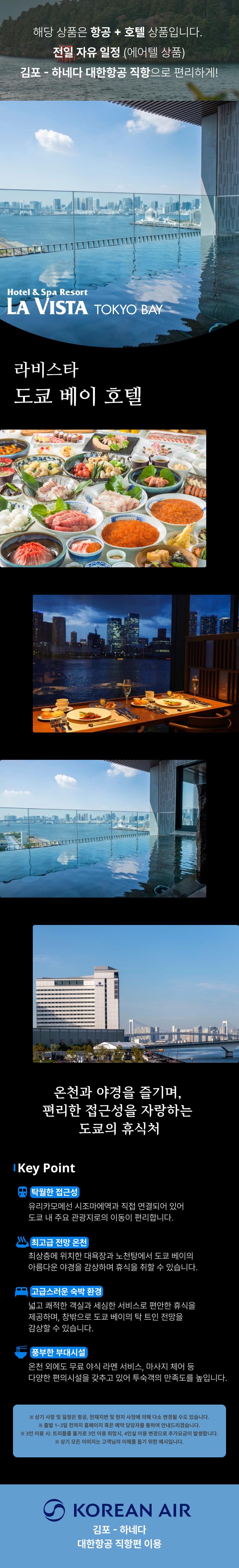 [호 텔] 라비스타 도쿄 베이 호텔(La Vista Tokyo Bay) TEL : 03-5548-2001확정 호텔은 출발 3일 전까지 홈페이지, 이메일 또는 문자 등을 통해 알려 드리겠습니다. | ||