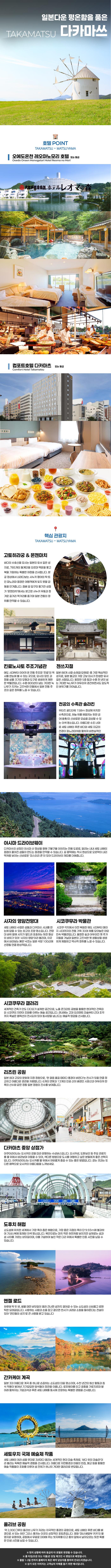 ☑ 인천↔다카마쓰 왕복구간 에어서울 직항편 이용 - 항공 시간 및 일정은 현지 상황에 따라 변경될 수 있습니다.☑ 본 상품은 한진관광 단독상품입니다.☑ 인천공항에서부터 전문투어리더가 동반합니다. ☑ 기본적으로 일정표 상의 호텔로 진행 예정이나, 확정은 아니며 동급의 타 호텔로 변경될 수 있습니다.